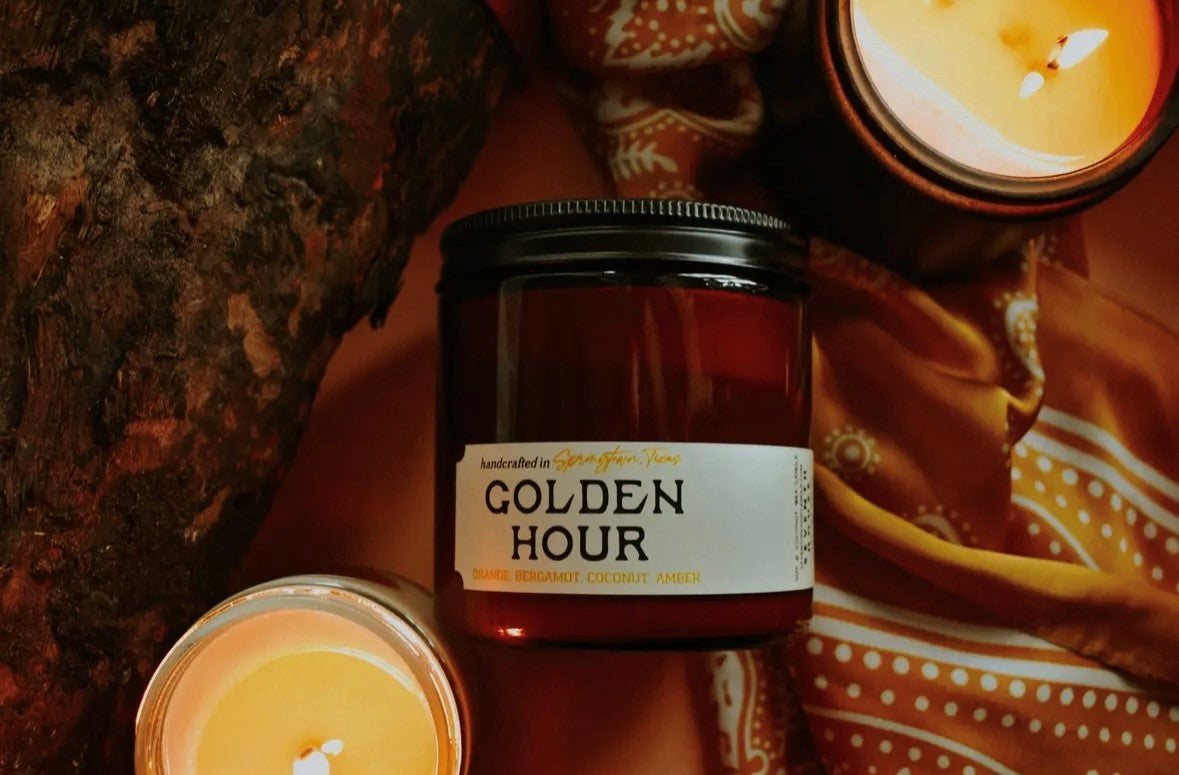 Our "Golden Hour" candle captures the ethereal moment with citrusy top notes of bergamot and sweet orange that meld into a heart of night-blooming gardenia and creamy coconut. A base of rich amber and vanilla evokes the sensation of sun-warmed, bronze skin.