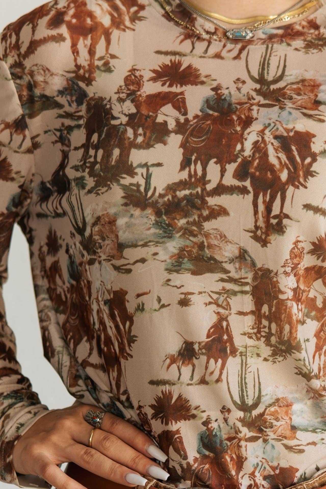 Featuring a vintage cowboy print on sheer, stretchy fabric, this long-sleeve beauty is perfect for layering or making a statement all on its own. The fitted silhouette hugs in all the right places while keeping things breathable and lightweight. Whether you're out on the town or adding some western flair to your everyday look, this top is a must-have.
